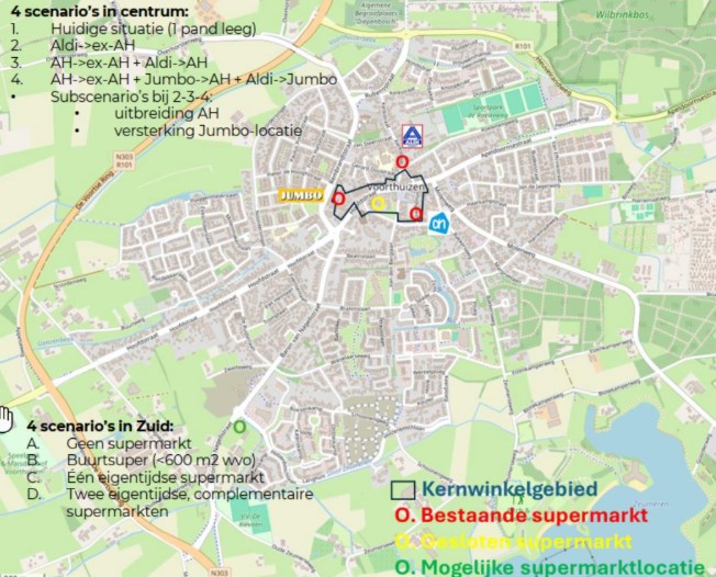 De supermarktnota Voorthuizen is beschreven in het raadsvoorstel Centrumplan: “Tevens wordt gelijktijdig binnen de portefeuille Economische Zaken de binnenkort te verschijnen Supermarktnota Voorthuizen 2025 uitgewerkt, die meer richting moet geven aan de toekomst van de oude AH locatie. Het belang van invulling van deze locatie is urgent en wordt getoetst aan het voorkeursscenario Centrumplan Voorthuizen.” Dit betekent dat het verkeersmodel in het voorkeursscenario Centrumplan Voorthuizen leidend is.